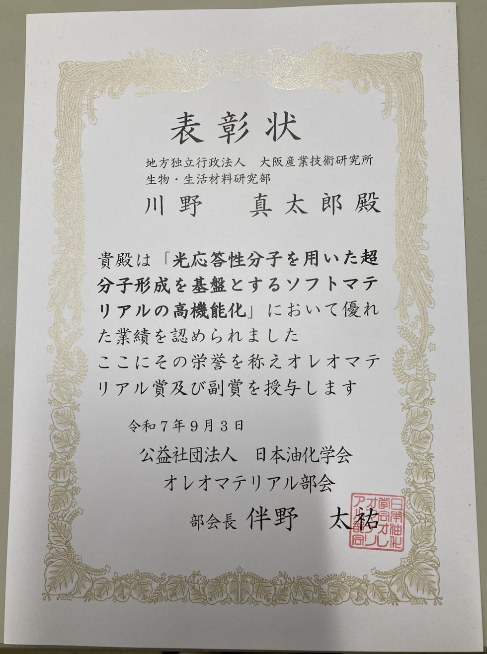 オレオマテリアル賞は、油化学分野における機能性分子の合成や新材料創製に関する技術・研究開発において、優れた業績をあげた部会員に授与されます。この度、生物・生活材料研究部の川野真太郎 主任研究員は、“光応答性分子を用いた超分子形成を基盤とするソフトマテリアルの高機能化”という業績題目に対してオレオマテリアル賞を受賞しました。