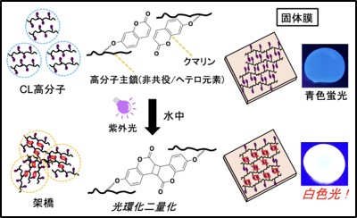 非共役化合物(注1)に、ヘテロ元素(注2)を含む特定機能部位(共役ユニットなど)を導入した高分子が、凝集状態において近接する分子間の空間的な相互作用を形成することで蛍光を示す「クラスター発光(CL)高分子」が注目されています。我々は、CL高分子に加工性・耐久性を付与した固体膜における可視光領域の発光特性を実現するため、共役ユニットである「クマリン」の蛍光特性に着目しました。クマリンは紫外線の照射で光環化二量体(注3)を形成しますが、二量体を形成すると一般的に蛍光強度が減少することが知られています。我々は、クマリンを高分子鎖に化学修飾することで、青色蛍光を示す新たなCL高分子を合成しました。このCL高分子が水中に分散している状態で紫外線を照射し、高分子内(または高分子間)でのクマリン光環化二量化反応を利用して“架橋”することで、塗布型の固体膜が得られることが分かりました。また、単体で存在するクマリンの場合とは異なり、二量化されたクマリンの存在により高い量子収率を有する強い白色発光の発現に成功しました(左図)。本技術は、環境に優しい水性プロセスに加え、外部光応答性の架橋を利用した初の白色発光塗膜の報告例であり、白色有機EL(エレクトロルミネッセンス)や、外部刺激応答性のセンサー材料への応用が期待されます。本成果をまとめた論文は学術誌「ACS Materials Lett.」に掲載されました。採用された図案(右図)では、光環化二量化で架橋して形成された塗膜が白色発光する様子を表現しています。