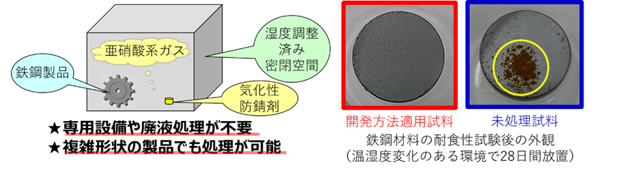 鉄鋼に対する防錆対策として、亜硝酸イオンを含む水溶液に浸漬する方法が良く用いられていますが、専用設備や廃液処理が必要で、さらに製品状態での処理が困難であるという課題があります。
