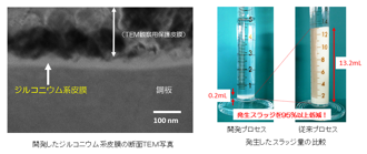 本処理薬剤では、重金属ではない、ある種の金属成分の添加が皮膜成長を促進するとともに、有機酸の微量添加が析出結晶の微細化に効果を発揮します。これらの添加剤の効果によって、皮膜性能の向上と環境負荷低減を同時に達成しました。従来のリン酸亜鉛処理法で作製した皮膜はミクロンオーダーであるのに対し、開発したジルコニウム系皮膜は50ナノメートル程度の薄膜であるにもかかわらず、従来と同等の耐食性・塗装密着性を実現することができました。さらに、従来法と比較し、発生するスラッジ量を95%以上削減することに成功しました。現在は、本事業で導入した処理ラインを活用して長期操業試験を実施し、実用化に向けた取り組みを行っています。