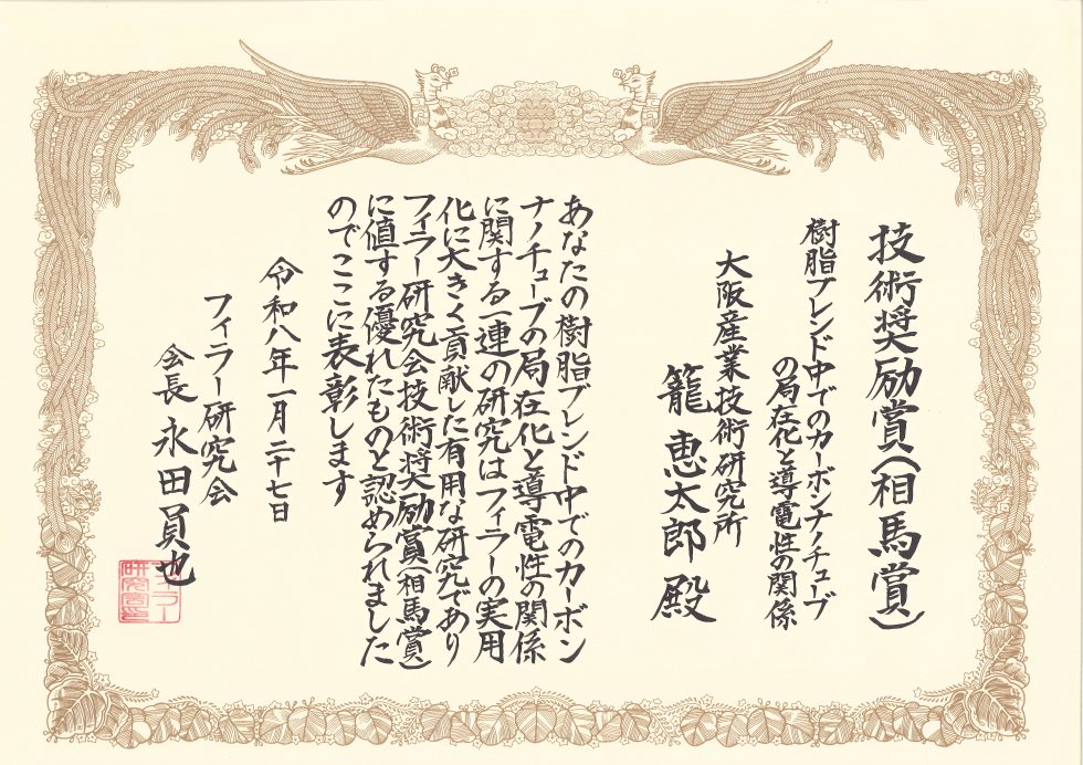 物質・材料研究部 籠 恵太郎 主幹研究員がフィラー研究会技術奨励賞を受賞しました